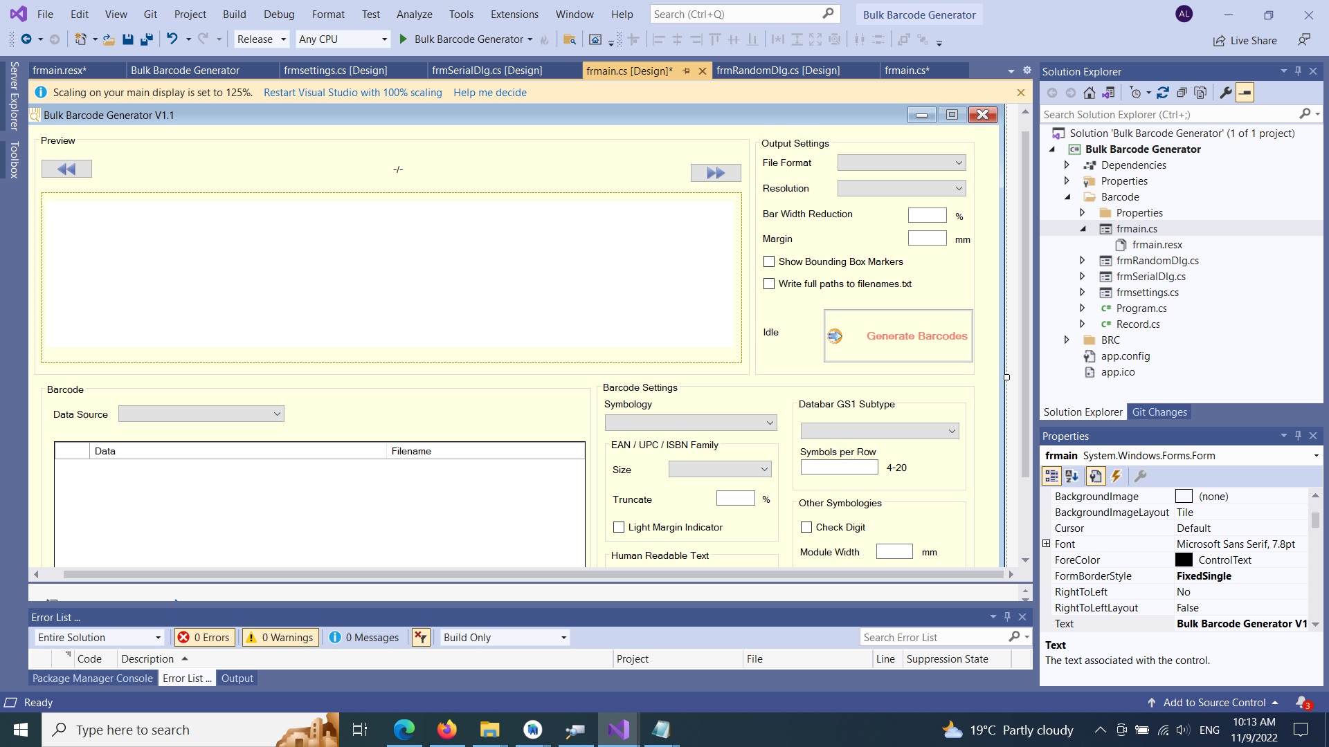 The project is written in C# 2019,for Windows batch creates thousands of barcodes in seconds. Multiple barcodes with serial numbers, barcodes from CSV / TXT files, random codes for product keys and much more. For mass creation of cellphone barcodes for bulk emails, invitations, coupons etc. Also suitable for importing serial barcodes via data merge into Word, Excel or Adobe Indesign.All common linear codes for retail, pharma, warehousing and the 2D symbologies QR, Datamatrix, PDF417 and Aztec.